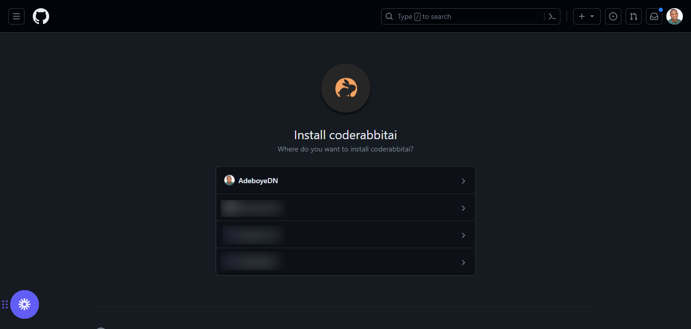On the GitHub page, you will be prompted to choose the organization where you want to install the CodeRabbit app. Select the organization to proceed.